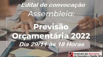 O Sindicato dos Bancários de Dourados e Região convoca os trabalhadores do ramo financeiro de sua base sindical para Assembleia Geral Ordinária que se realizará no dia 29 de novembro de 2021, (segunda-feira) às 18h, quando estará em pauta a Apreciação e Votação da Previsão Orçamentária do Sindicato para o ano de 2022.