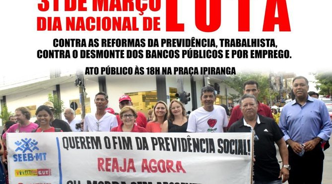 Cuiabá MT - Nesta sexta-feira, dia 31 de Março é Dia Nacional de Luta contra as reformas da Previdência e trabalhista de Michel Temer. O Dia Nacional de Luta foi convocado pelas Centrais Sindicais, pela FBP (Frente Brasil Popular) e a FPSM (Frente Popular Sem Medo). Em Cuiabá, a concentração está marcada para ás 18h, na Praça Ipiranga.