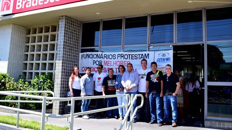 Nesta quinta-feira (03.08), a direção do Sindicato dos Bancários de Mato Grosso (Seeb/MT) realizou Ato de Protesto na frente do Bradesco, Agência Prainha, Centro de Cuiabá, capital de Mato Grosso. Os bancários e bancárias estão sofrendo cobranças excessivas e enfrentando abuso de poder da gerência.