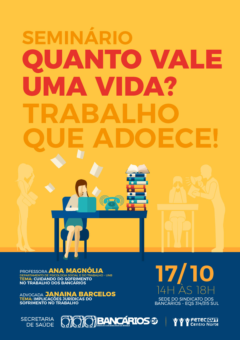 A professora doutora Ana Magnólia, do Departamento de Psicologia Social e do Trabalho da UnB, coordenadora da Clínica do Trabalho no Sindicato, falará sobre ‘Cuidando do sofrimento no trabalho dos bancários’, e a advogada da assessoria jurídica previdenciária do Sindicato, Janaína Barcelos, abordará as ‘Implicações jurídicas do sofrimento no trabalho’.