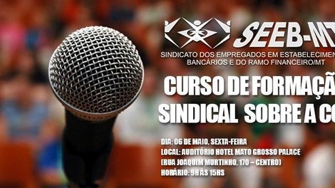 Cuiabá MT - O Sindicato dos Bancários de Mato Grosso (SEEB/MT) realizará na sexta-feira, (06.05) curso de formação Sindical em torno da Convenção Coletiva de Trabalho dos Bancários e Financiários (CCT). O evento será realizado no auditório do Hotel Mato Grosso Palace, (Rua Joaquim Murtinho, 170 – Centro), das 9h às 15h.