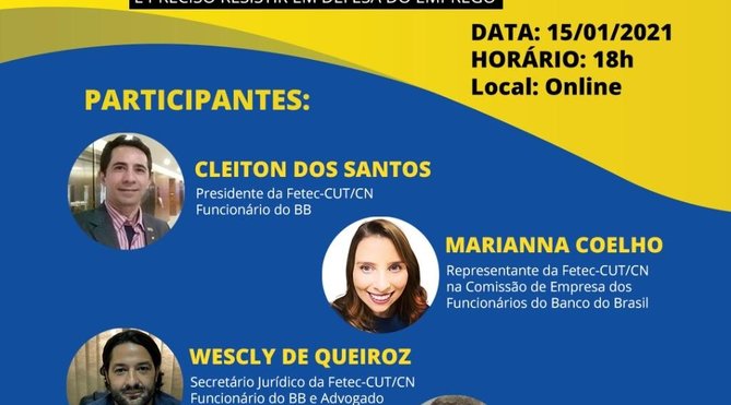 Plenária às 18h(MS) – Os trabalhadores do BB estão convidados também a participarem da Plenária Virtual que o sindicato realiza a partir das 18 horas com as participações da representante da Fetec-CUT/CN na CEBB, Marianna Coelho, com o presidente da Fetec-CUT/CN, Cleiton dos Santos, com o Secretário Jurídico da Fetec-CUT/CN, o advogado Wescly Mendes de Queiroz e do Presidente do Sindicato dos Bancários de Dourados e Região, Carlos Longo. Todos funcionários do Banco do Brasil.