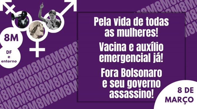 “Neste 8 de março, nos mobilizamos para gritar com indignação e fúria feminista Fora Bolsonaro! Vacina para toda a população! Auxílio Emergencial já! Pelo fim das violências contra as mulheres!”, diz o manifesto.