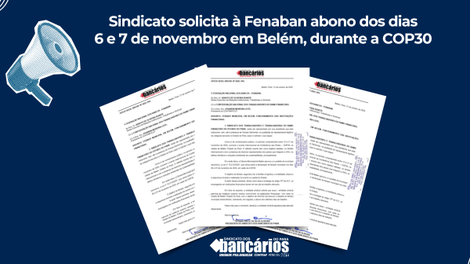 O Sindicato dos Bancários do Pará encaminhou ofício à Federação Nacional dos Bancos (Fenaban) solicitando o abono dos dias 6 e 7 de novembro de 2025 para os trabalhadores e trabalhadoras bancárias das agências localizadas em Belém, em razão dos feriados municipais extraordinários decretados durante a COP30.