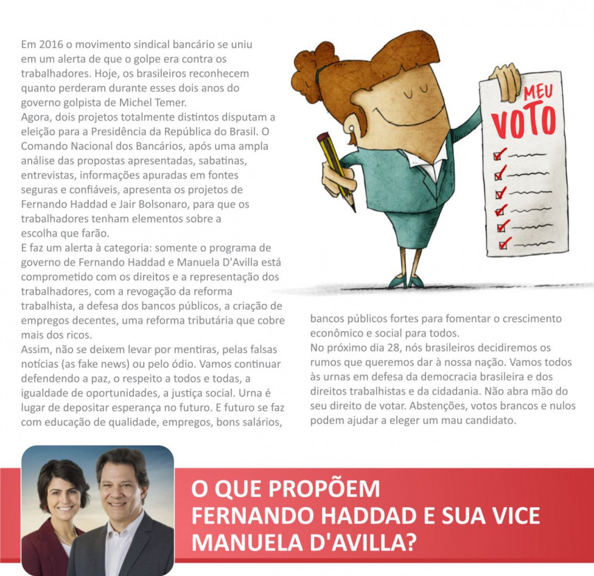 Só Haddad respeitará direitos dos trabalhadores e os bancos públicos, afirma Comando Nacional