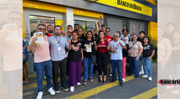 O Sindicato dos Bancários do Pará realizou, nesta quarta-feira (27), um ato em frente à agência Canudos, em Belém, dentro do Dia Nacional de Luta em Defesa do Banco do Brasil, aprovado na 27ª Conferência Nacional dos Bancários. A mobilização reforçou a denúncia contra os ataques orquestrados ao BB, que visam fragilizar a instituição, um patrimônio construído com o trabalho do povo brasileiro, para beneficiar o capital privado e interesses estrangeiros.