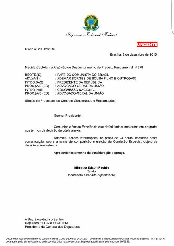A decisão liminar de Fachin saiu no mesmo dia em que a comissão especial foi eleita por 272 votos da oposição e dissidentes da base aliada, contra 199 dos aliados. Com isso, a sessão marcada para amanhã para concluir a votação da comissão com outros 36 nomes não deve ocorrer.