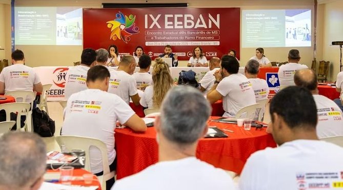 O 9º EEBAN/MS teve início na sexta-feira, dia 25 de julho, com a abertura oficial, e seguiu durante toda a manhã de sábado, dia 26, com discussões sobre a conjuntura política e econômica, a comunicação popular, os avanços tecnológicos, a inteligência artificial e o impacto no trabalho bancário, além da terceirização e pejotização no setor.