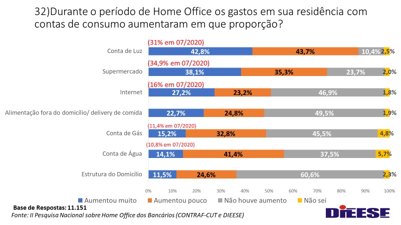 Dados da 2ª Pesquisa Nacional sobre Home Office dos Bancários, realizada pela Confederação Nacional dos Trabalhadores do Ramo Financeiro (Contraf-CUT), em parceria com o Departamento Intersindical de Estatística e Estudos Socioeconômicos (Dieese) aponta que durante o período de home office realizado em decorrência do isolamento da pandemia de covid-19, os gastos com contas na residência aumentaram 86,5% com energia elétrica; 73,4% com supermercado; 50,4% com internet; 55,5% com conta de água (veja outros números no gráfico).