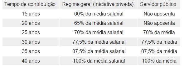 A nova proposta vai diminuir o valor a ser pago aos trabalhadores em praticamente todas as faixas, conforme tabela abaixo. Mesmo quem conseguir atingir a idade mínima imposta na nova proposta, mas contribuir, por exemplo, apenas 15 anos, que é o tempo mínimo exigido, vai receber apenas um benefício parcial, de apenas 60% da média de todas as suas contribuições.