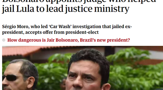 O The Guardian informou seus leitores que Sergio Moro, o "juiz que destruiu a corrupção e ajudou a preparar o caminho para a impressionante vitória eleitoral de Jair Bolsonaro no domingo", agora aceitou um cargo no "governo do presidente de extrema-direita". O jornal frisou que Moro "preparou o caminho" para Bolsonaro prendendo "seu principal rival", o ex-presidente Lula.