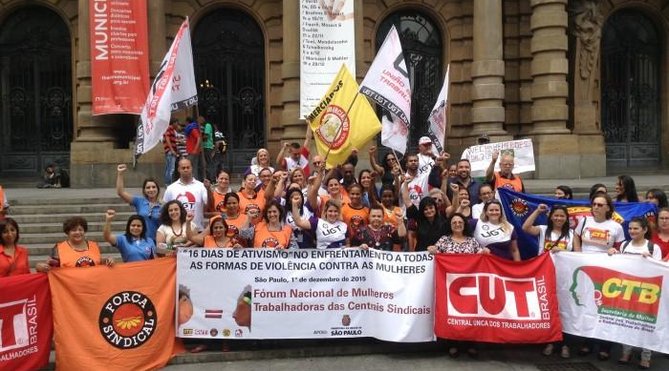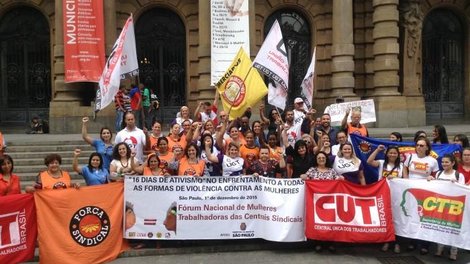 As mulheres que integram o Fórum Nacional de Mulheres Trabalhadoras das Centrais realizaram na tarde desta terça-feira (1º), na praça Ramos de Azevedo, em São Paulo, ato pelo fim da violência contra as mulheres, para marcar os “16 dias de ativismo” e de reflexão sobre o Dia Mundial de Luta contra a AIDS, também comemorado no dia 1º de dezembro. O Fórum é formado pelas secretarias de mulheres de várias centrais sindicais, incluindo a CUT e a Contraf-CUT.