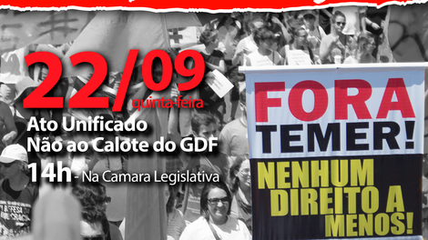Brasília - Inúmeras categorias de trabalhadores do Distrito Federal têm atividades programadas para o próximo 22 de setembro – Dia Nacional de Paralisação e de Mobilização, convocado pela CUT e as Frentes Brasil Popular e Povo Sem Medo. Setores essenciais como Educação, serviço público municipal, distrital e federal, comércio e serviços e o ramo financeiro realizarão paralisações, assembleias ou atos contra os ataques à classe trabalhadora, que tomaram proporção descomunal com o golpe de Estado dado por Michel Temer e base parlamentar aliada conservadora ao serviço da elite econômica e social.