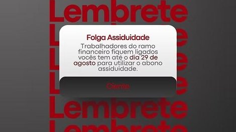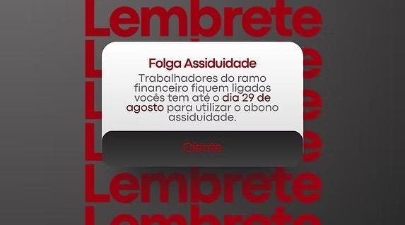 O Sindicato dos Trabalhadores do Ramo Financeiro do Estado do Amapá (Sintraf-AP), alerta sobre o prazo limite para a solicitação da folga do ‘Abono Assiduidade’, os trabalhadores e trabalhadoras têm até o dia 29 de agosto para utilizar este benefício. Este direito é conquista da categoria desde 2013.