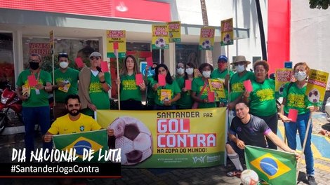 Bancários e bancárias do Santander realizaram protestos em agências de todo o país contra a obrigatoriedade, imposta pelo banco, de compensar as horas não trabalhadas durante os jogos da seleção brasileira na Copa do Mundo. “O Santander está indo na contramão de todos os bancos que atuam no Brasil”, pontuou a coordenadora da Comissão de Organização dos Empregados (COE) do Santander, Lucimara Malaquias, lembrando que o banco espanhol recebeu um ofício solicitando o abono das horas não trabalhadas, da Confederação Nacional dos Trabalhadores do Ramo Financeiro (Contraf-CUT) e demais entidades de representação dos empregados que fazem parte do Comando Nacional dos Bancários, mas ainda mantem sua posição de obrigar os trabalhadores de repor o tempo.