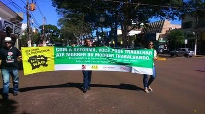 Estudantes e servidores públicos municipais, estaduais e federais estão reagindo e têm de reagir mesmo, porque senão morrem sem se aposentar, disse o presidenta do Sindicato dos Bancários de Dourados Ronaldo Ferreira Ramos, o que está em jogo é o fim da aposentadoria, o fim dos direitos trabalhistas, da CLT, de tudo que conquistamos. Não podemos permitir que isso aconteça e este movimento de hoje é uma reação da sociedade. O protesto desta quarta foi convocado pela Centra Única dos Trabalhadores (CUT) e movimentos sociais