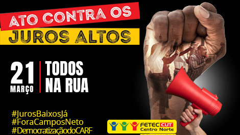 Os trabalhadores vão mais uma vez às ruas e ocupar as redes sociais nesta terça-feira 21 de março, data da reunião do Copom (Conselho de Política Monetária), para exigir do Banco Central a redução da taxa básica de juros (Selic), a saída do presidente da entidade Roberto Campos Neto e a democratização do Conselho de Administração de Recursos Fiscais (Carf). O dia de protesto foi convocado pelas centrais sindicais e movimentos sociais e está sendo convocado na região também pela Federação dos Bancários do Centro-Norte (Fetec-CUT/CN).