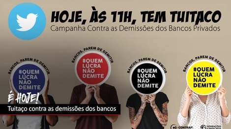 Hoje (sexta-feira, 4 de dezembro) vai ter um novo tuitaço contra as demissões realizadas pelos bancos. Será às 11h, com a hashtag #QuemLucraNãoDemite. A mobilização em defesa do emprego faz parte da campanha organizada pela Confederação Nacional dos Trabalhadores do Ramo Financeiro (Contraf-CUT) e pelos sindicados dos bancários.