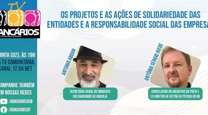 O TV Bancários que vai ao ar nesta quinta-feira (2) tem como tema “Os projetos e as ações de solidariedade das entidades e a responsabilidade das empresas com o desenvolvimento econômico e social sustentável – Enfrentamento aos desafios sociais do país com permanente e efetivo combate às desigualdades sociais, à miséria, à fome e às tragédias humanitárias”.
