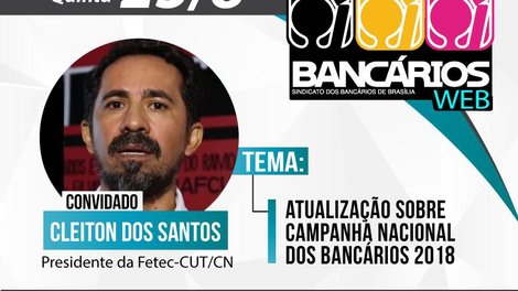 Brasília - Na edição desta quinta-feira (23), o TV Bancários Web entrevista o presidente da Federação dos Bancários do Centro Norte (Fetec-CUT/CN), Cleiton dos Santos, que atualiza a categoria bancária sobre a Campanha Nacional dos Bancários. O programa será transmitido pelas redes sociais do Sindicato a partir das 17h.