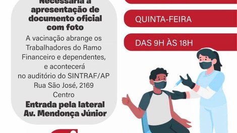 Em conjunto com a Prefeitura de Macapá, estamos convocando os Trabalhadores do Ramo Financeiro e familiares para vacinação contra Sarampo e Influenza H1N1. Pedimos aos que puderem compartilhem a informação com os colegas. A vacinação vai acontecer no dia 12 de agosto (quinta-feira), das 9h às 18h no auditório do SINTRAF/AP, na Rua São José, nº2169 – Centro (entrada pela lateral na Av. Mendonça Júnior). #ᴠᴀᴄɪɴᴀᴘᴀʀᴀᴛᴏᴅᴏs.