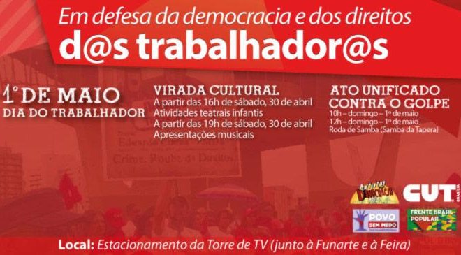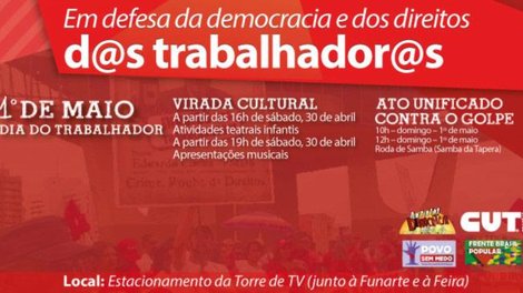 Brasília - Em defesa da democracia e dos direitos da classe trabalhadora, a CUT Brasília e outras dezenas de entidades que compõem o Comitê em Defesa da Democracia e Contra o Golpe e as Frentes Brasil Popular e Povo Sem Medo realizarão, dentro das comemorações pelo 1º de Maio, a Virada Cultural.