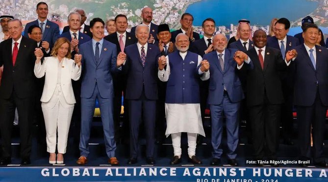 A taxação de grandes fortunas como uma das formas de financiar as mudanças necessárias no cenário internacional, é um dos 85 pontos consensuados e expressos na declaração final da Cúpula do G20. O documento inclui prioridades da presidência do Brasil à frente do grupo. E reconhece que a desigualdade dentro dos países e entre eles está na raiz da maioria dos desafios globais. Daí a importância da construção da Aliança Global contra a Fome e a Pobreza como consenso e que já tem em caixa 145 bilhões de reais. O objetivo inicial da aliança é alcançar, até 2030, 500 milhões de pessoas, com transferência de renda; 150 milhões de crianças, com alimentação escolar; 200 milhões de mulheres e crianças de até 6 anos, com saúde e acompanhamento da gestação e primeira infância; além de 100 milhões de pessoas, com emprego e empreendedorismo.